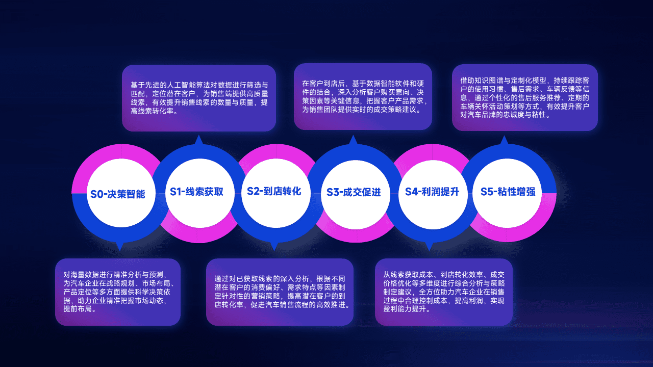 通过拓宽潜在客户来源、、优化线索分配并提高到店转化率,,,,以增强销售效率。。同时,,,利用线索数据不断优化分析模型,,,有效提升转化率,,,,扩大营销影响力。。。
